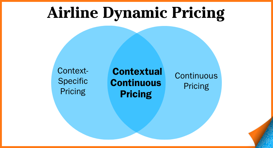 Airline dynamic pricing is a broad term that includes two core components: Continuous Pricing and Context-Specific Pricing. This diagram illustrates that you can have context-specific pricing without continuous pricing, and you can have continuous pricing without context-specific pricing. Either of those is dynamic pricing. But the ultimate goal where the industry is headed is to do the combination of both based on customers’ price sensitivity and willingness-to-pay and leave class-based pricing practices in the past.