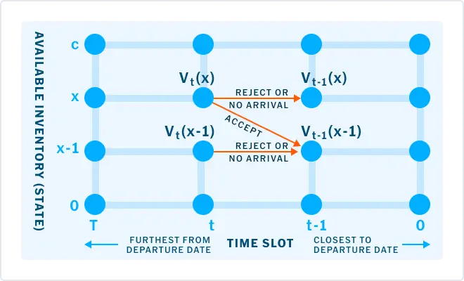 Dynamic programming evaluates RM decisions over time by balancing current demand with the expected value of future demand against capacity. By comparing the value of accepting a booking now versus holding inventory for later, it helps deliver stronger outcomes across the network.