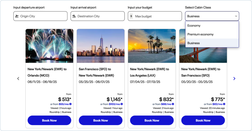 PROS partners with Upgrade to help you offer flexible payment solutions, so customers can book now and pay over time. With this integration, monthly payment amounts are shown alongside real-time fares within each airModule.
