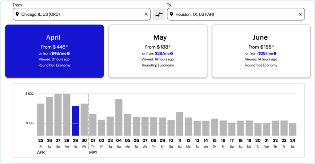 PROS partners with Upgrade to help you offer flexible payment solutions, so customers can book now and pay over time. With this integration, monthly payment amounts are shown alongside real-time fares within each airModule.